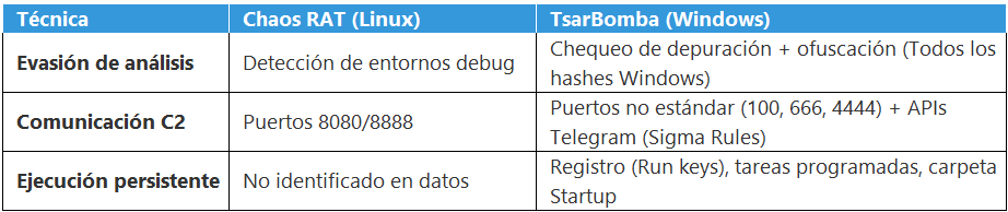 Análisis forense revela dos campañas coordinadas: Chaos RAT atacando sistemas Linux con falsas herramientas de red, y TsarBomba comprometiendo Windows mediante técnicas de persistencia y ofuscación. Ambas familias muestran capacidades de evasión avanzada y comunicación C2 cifrada.